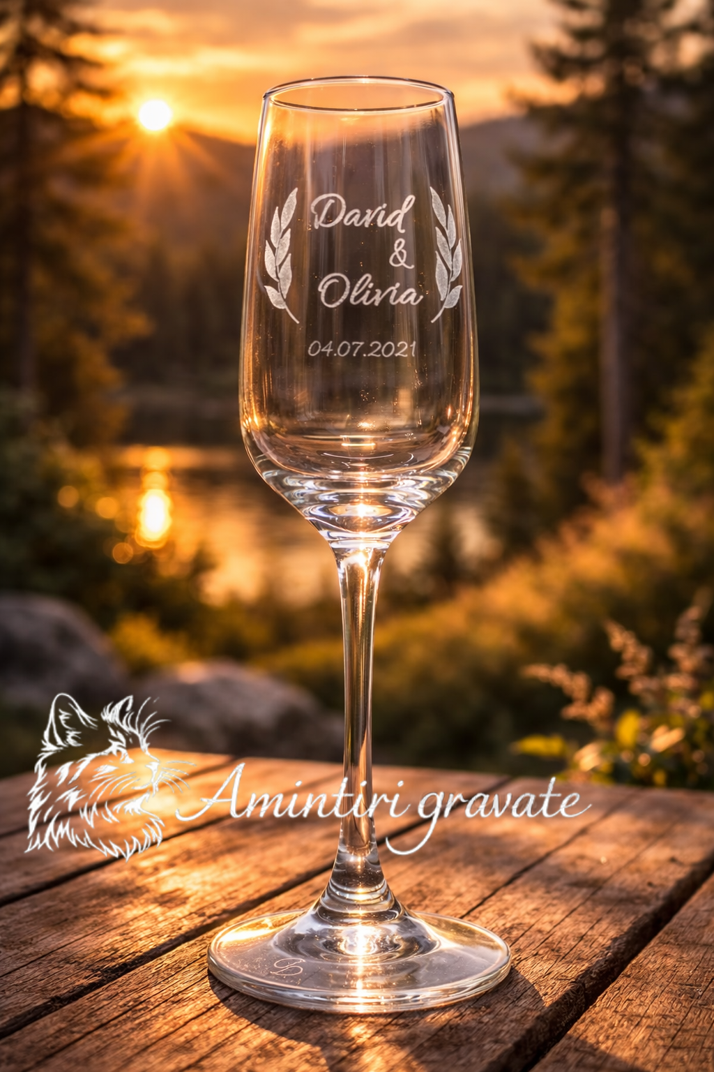 Pahar Șampanie Gravat cu Nume și Dată Model Elegant – Nuntă